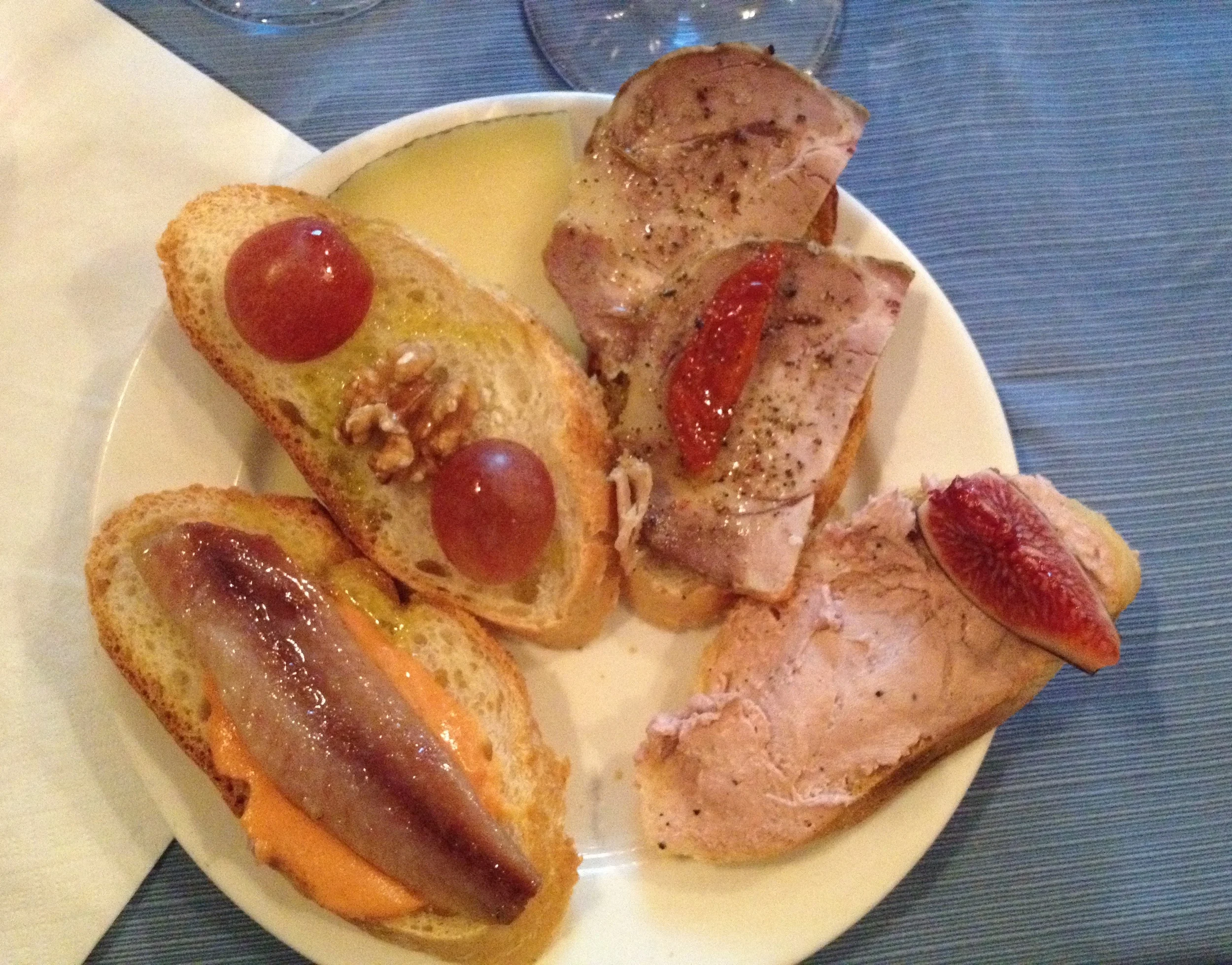 Tapas at La Tana: (from left) salted sardine with salmorejo, walnut--grape-olive oil, lomo (pork tenderloin) with sundries tomato, pat with fig.