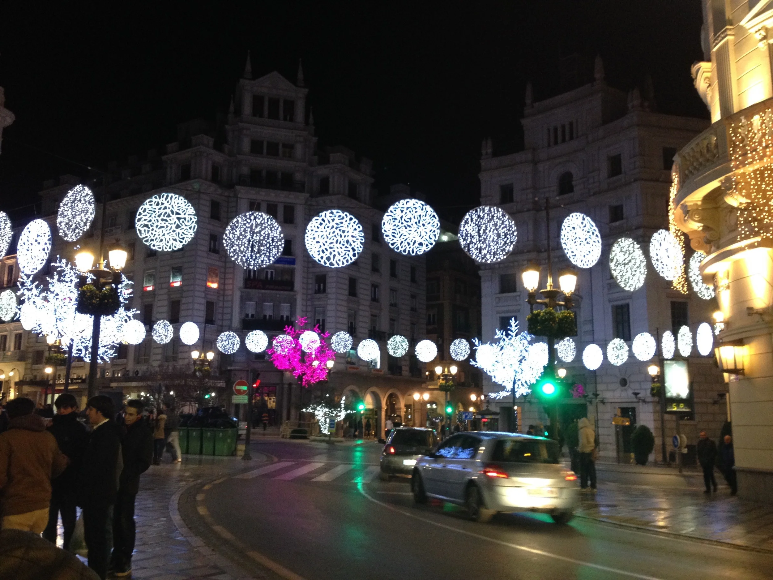 The center of the city, right where Calle Recogidas and Calle Reyes Católicos meet, all dolled up with lights for La Navidad.