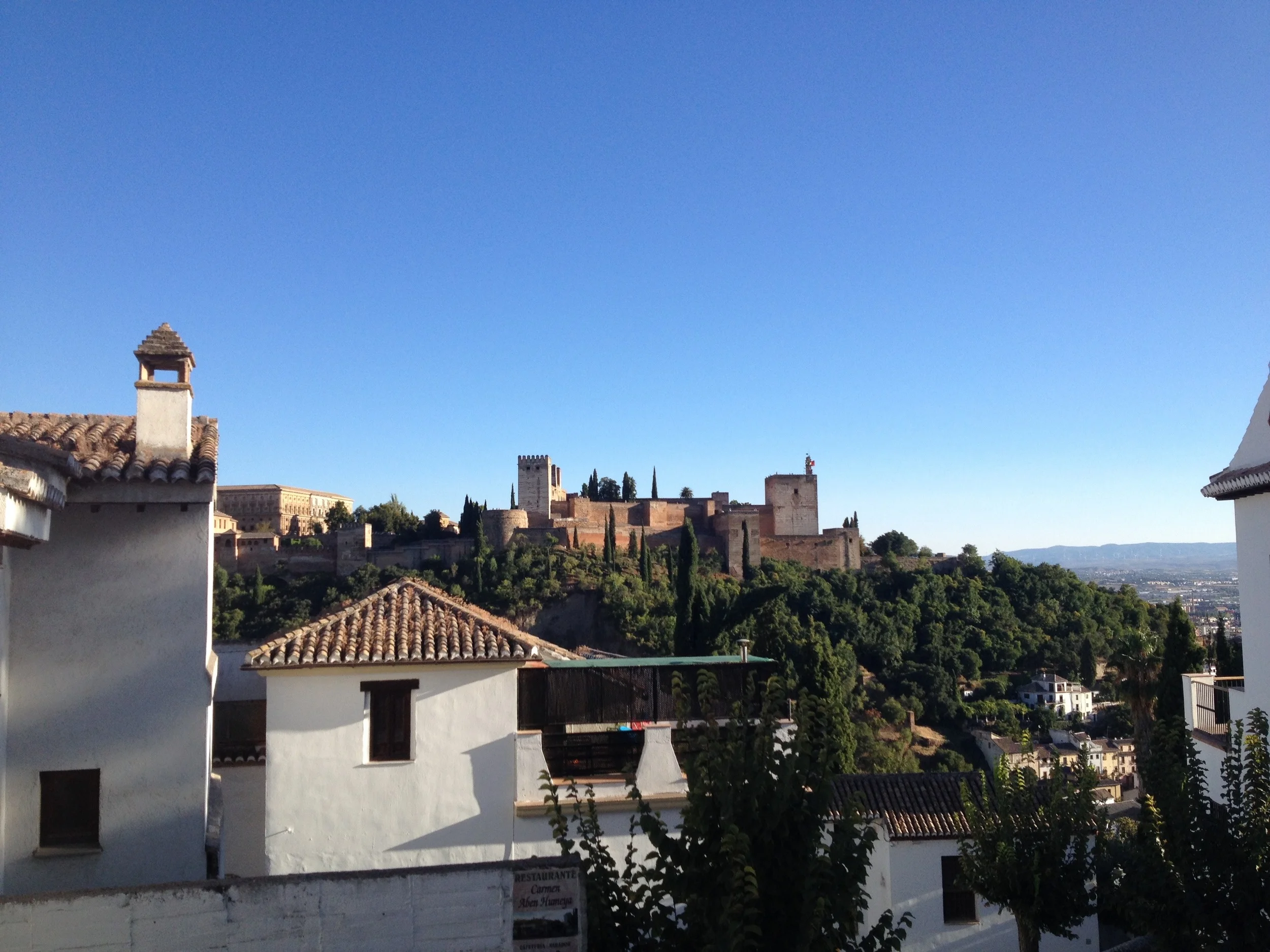 View of the Alhambra on a cloudless day from the Albaicín.